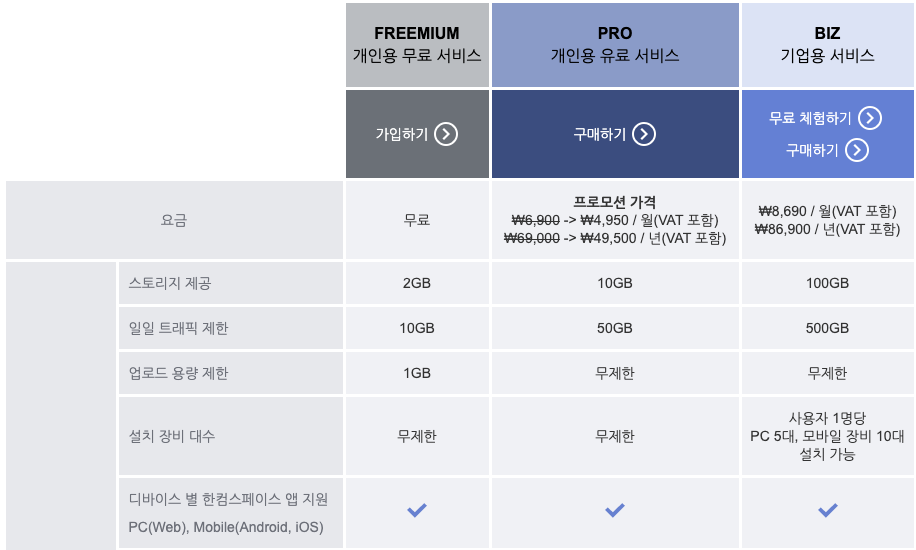 일반사용자는 간단한 가입 이후에 무료로 사용이 가능하다. 사용관련 plan은 아래와 같다.