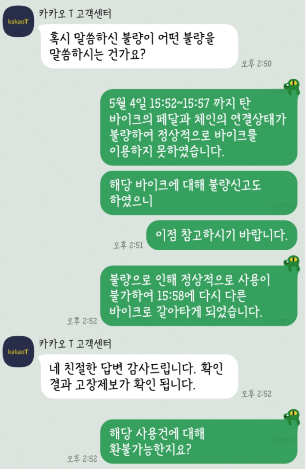 이후 카카오 T 고객센터를 통해 기존 고장난 자전거 사용건에 대한 환불 문의를 진행하였다. 카카오T 고객센터는 카카오톡 내의 챗봇으로 처음 진행하고 환불에 따른 상세한 내용을 확인하기 위해서 전문상담사가 붙어서 내용을 확인하였다. 챗봇이 끝나고 전문상담사와 직접 대화하는데 까지 3분도 채 걸리지 않았다.