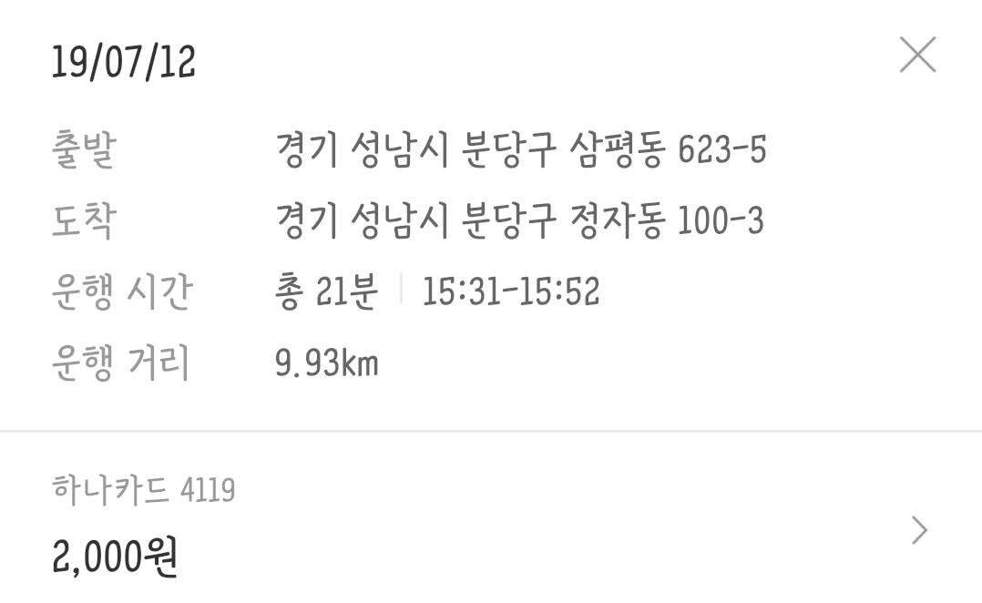 카카오자전거를 사용한다면 탄천을 따라 집 <-> 회사 편도에 21분 / 2,000원에 이용할 수 있다.