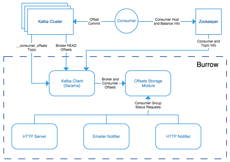 기존 Kafka client의 consumer의 metrics() method를 사용하여 lag metric(records-lag-max)을 기록할수 있지만, 이는 가장 뒤처진 파티션의 현재 지연을 보여주므로 다른 파티션에서의 정상작동을 잘 감지하기가 어렵다. 또한, consumer자체가 정상작동함을 가정해야한다.(컨슈머가 멈추면 lag감지 불가) 그러므로 외부 지연 모니터링을 사용해야하는데 그 중 하나가 Linkedin의 Burrow이다.