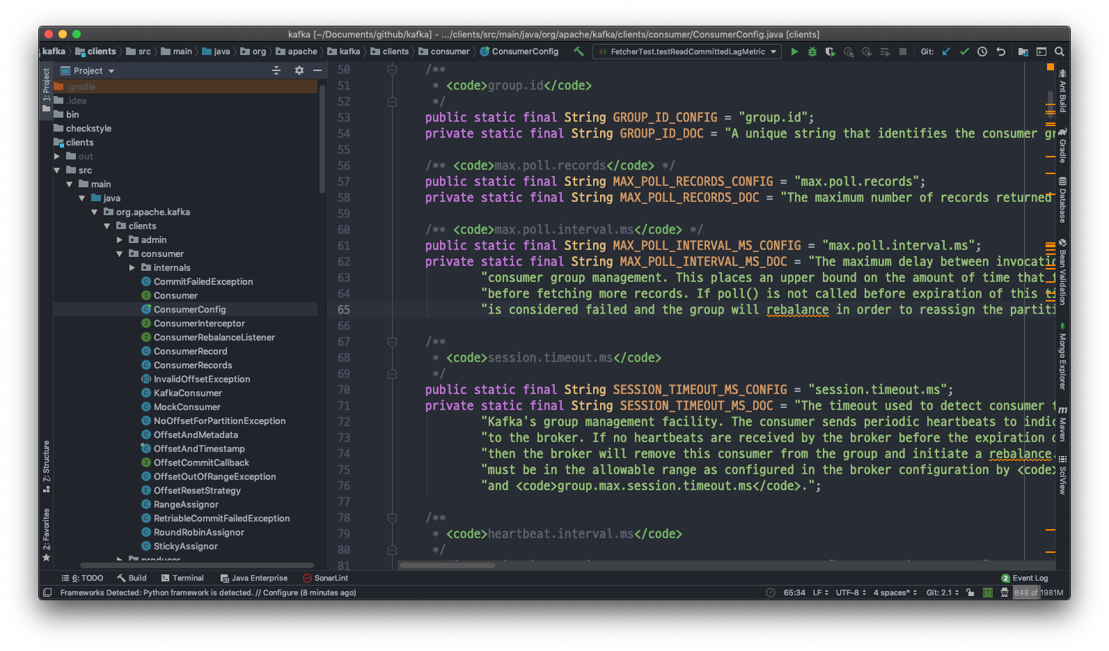 아래는 github에 올라가 있는 kafka source 중 ConsumerConfig.java file의 code인데 너무 길어서 가로 스크롤이 생긴 것이 보인다.