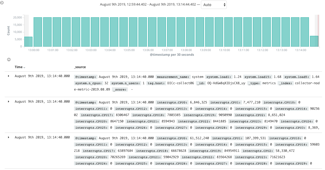 상기와 같이 설정하고, telegraf를 실행하면 elasticsearch에 data를 전송을 시작한다.