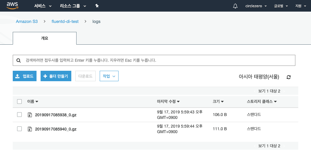 위와 같이 정상적으로 들어오는 모습을 확인할 수 있다. 두번째 kafka topic에 들어오는 속도가 약간 느린것 같은데 아마 producer설정이나 buffer로 인한 약간의 delay로 보인다. 이 부분은 추후 확인해볼것이다. 두번째 kafka topic인 fluentd-test까지 도착한것을 확인했으니 이제 s3에 정상적재되었는지 확인해보자.