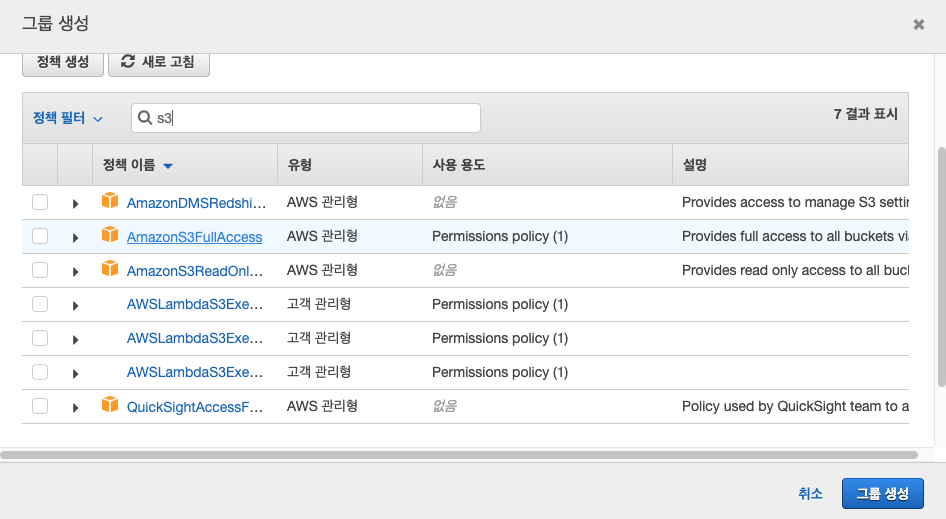 match의 s3에서는 s3저장역할을 실질적으로 수행하는 녀석인데, s3의 bucket, region, aws key, aws sec를 기본적으로 설정해야한다. aws key, sec을 s3에 저장하는 용도로 사용하기 위해 IAM에서 s3FullAmazonS3FullAccess group으로 user를 생성하여 key, sec을 발급받았다.