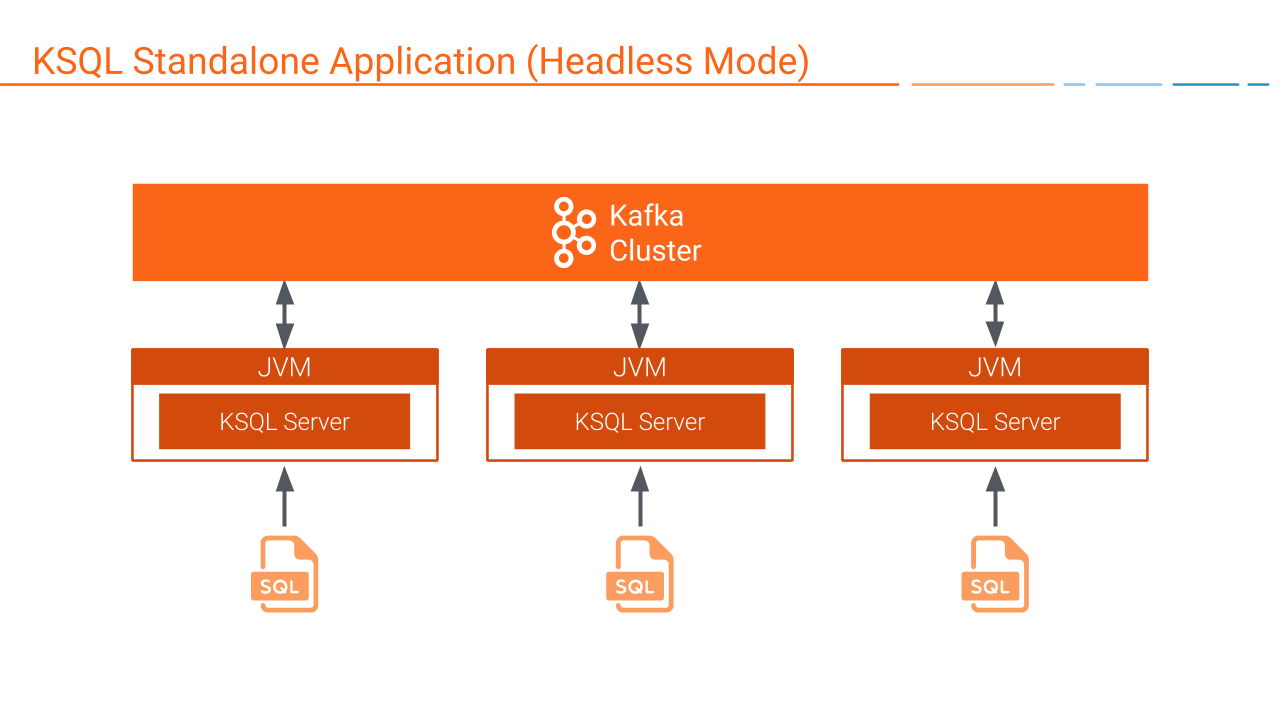 Headless 모드는 상용환경에서 KSQL application을 배포하기 위해 사용된다. Headless모드 사용시, REST interface는 사용 불가하다. KSQL서버는 오직 SQL file만을 사용하여 동작한다. SQL file은 사용자가 작성한 KSQL statement와 query를 포함하고 있다. Headless 모드는 ETL application 배포에 적합하다.