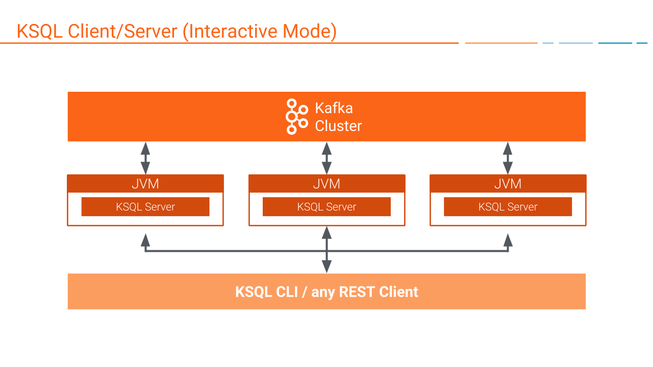 Interactive 모드는 KSQL application을 개발할 때 사용할 수 있다. KSQL서버를 interactive모드로 사용시, REST 인터페이스를 통해 CLI나 Confluent Control Center을 사용 할 수 있다.