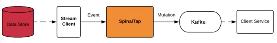 Data store(db 등)로 부터 데이터 변화를 확인하면 SpinalTap으로 가게되고 데이터의 변화를 일부 파싱하여 변경, kakfa로 produce하는 형태를 띈다.