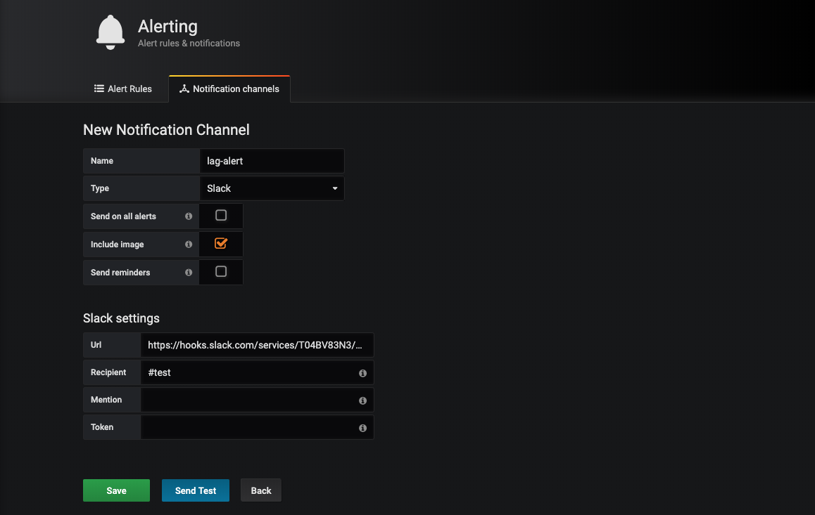 Alert를 받고 싶은 그래프에서 Alert configuration을 추가합니다. 위 쿼리는 1분마다, 지난 60초간 lag의 평균값이 10 이상일 경우에 Slack 메시지를 보내도록 설정하였습니다. 필요에 따라 설정을 변경하여 적용하면 lag 모니터링시 유용합니다.