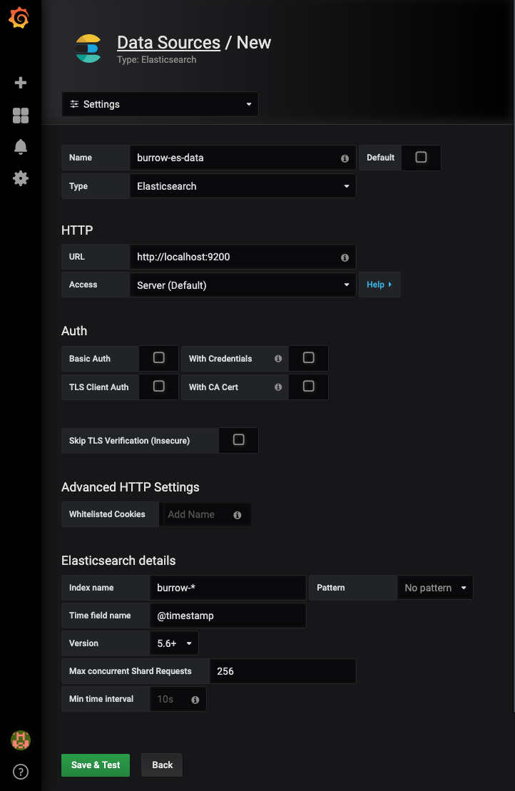 ▶ Datasource에 Elasticsearch, index pattern 정보 추가