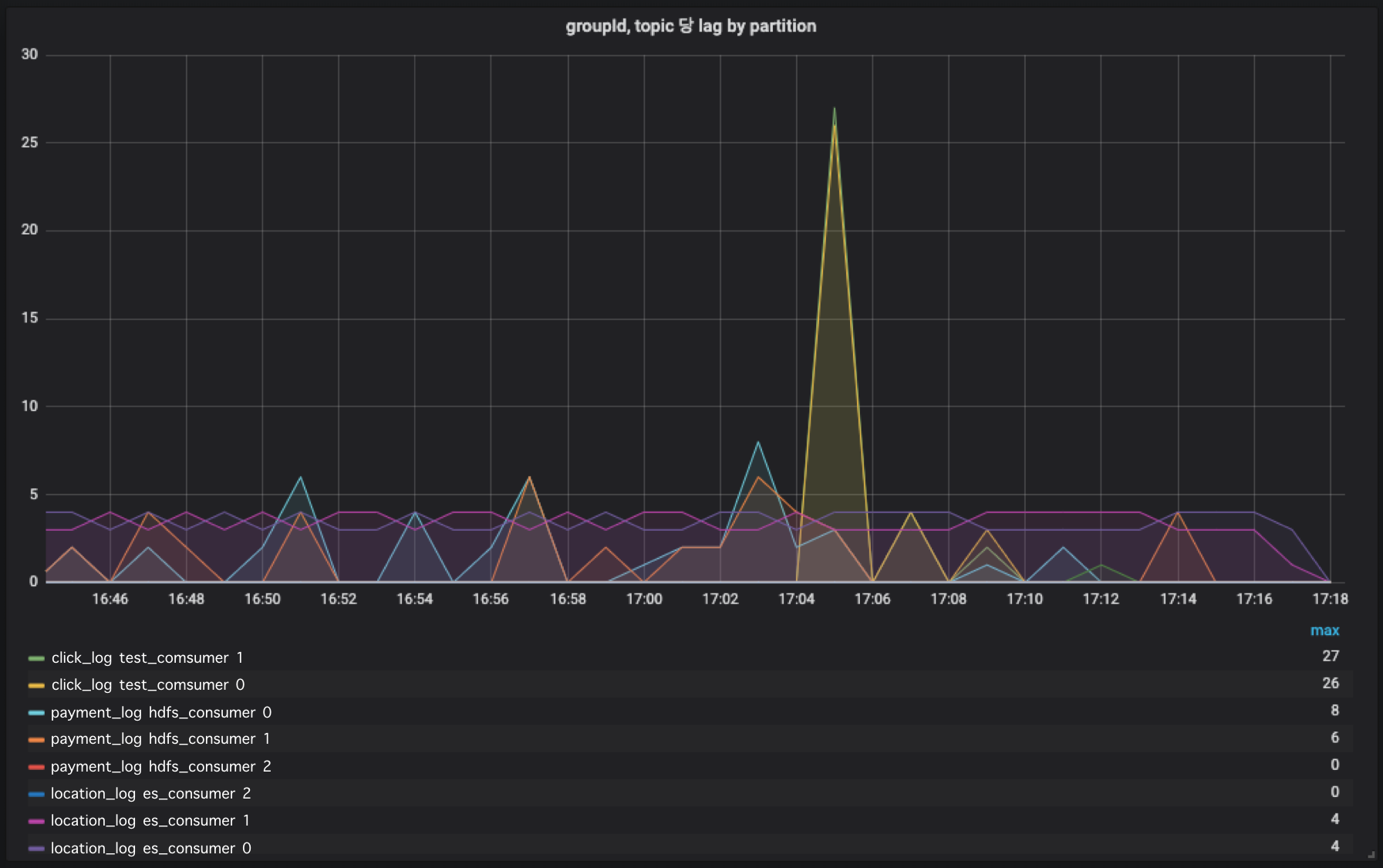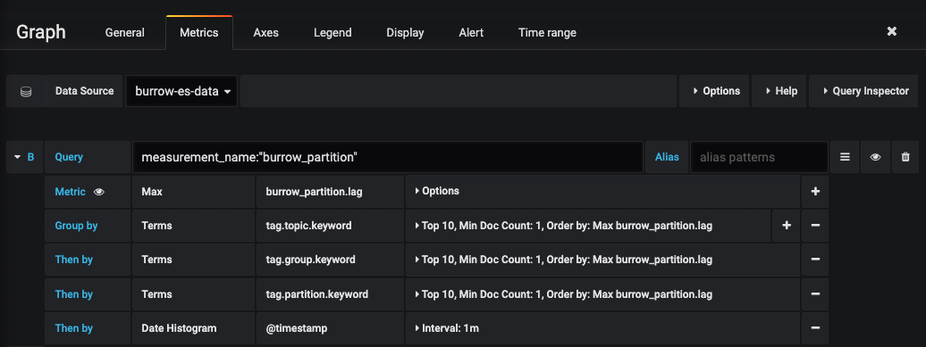 burrow에서 수집한 데이터 중 measure_ment_name이 burrow_partition 인것만 대상으로 lag을 수집합니다. topic, groupId, partition 별로 group by로 묶어주시면 topic, groupId, partition별 lag추이를 확인할 수 있습니다.