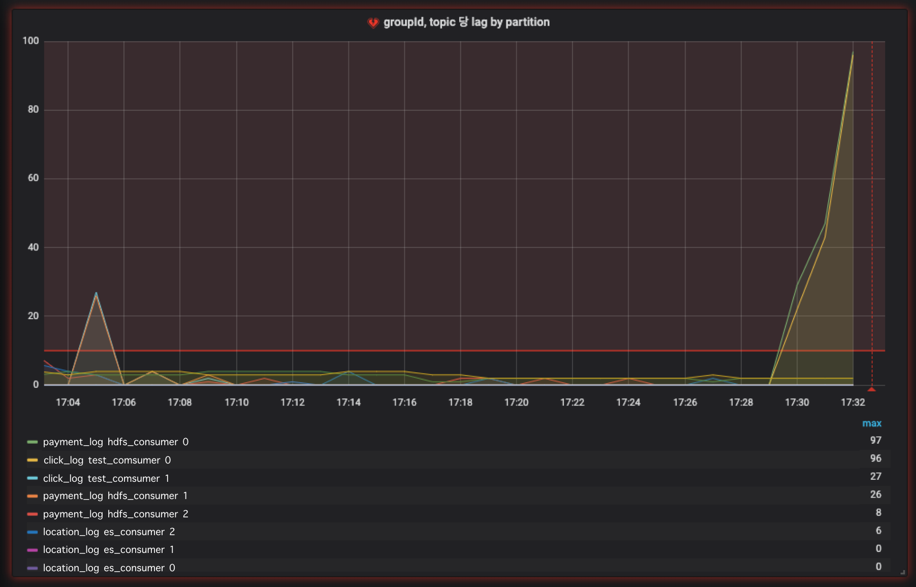 burrow에서 수집한 데이터 중 measure_ment_name이 burrow_partition 인것만 대상으로 lag을 수집합니다. topic, groupId, partition 별로 group by로 묶어주시면 topic, groupId, partition별 lag추이를 확인할 수 있습니다.