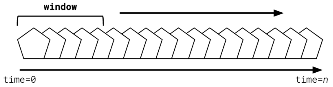 일부 데이터가 겹치면서 일정 기간동안의 데이터 모음. (ex) 5분마다 45분 동안의 기간에 대한 데이터 모음.) 반드시 window기간보다 반복(period)기간이 적어야한다.