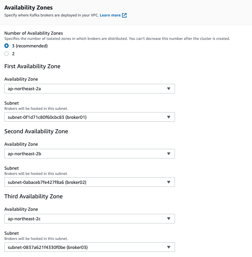 Kafka broker의 가용성을 위해 broker가 설치될 Availability Zone을 설정해야합니다. 옵션으로 2개의 AZ 혹은 3개의 AZ로 구성할지 설정할 수 있는데, AWS에서는 3으로 설정하여 구성하는 것을 추천합니다. 1)에서 구성한 VPC와 Subnet을 기준으로 아래와 같이 MSK AZ를 구성하였습니다.