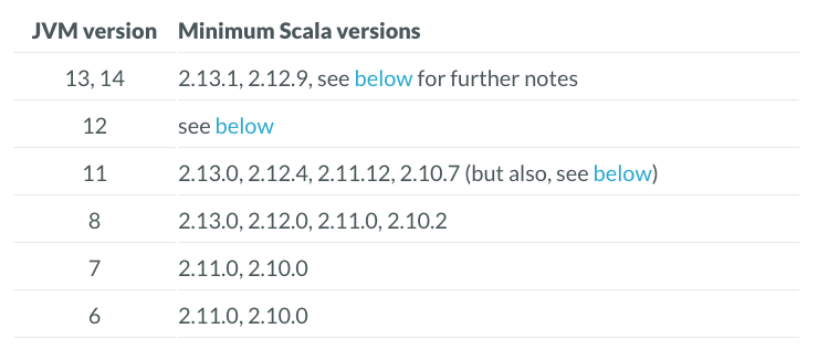 Scala는 JVM위에서 돌아가는 언어이며, Scala버젼별로 JVM 버젼의 호환성이 있으므로 아래 표를 기준으로 Scala버젼을 운영해야합니다.