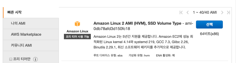 ec2는 aws에서 발급가능한 가상머신을 뜻합니다. 이번에는 테스트 목적의 머신이므로 Amazon Linux 2 AMI(Amazon Machine Image)를 t2.micro로 발급받습니다.