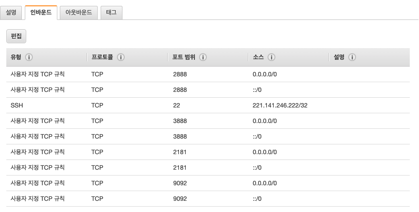 zookeeper와 카프카 클러스터가 각각 통신을 하기 위해서는 아래와 같이 inbound규칙을 추가해야합니다. 기본적으로 aws ec2를 발급받은 뒤 security group의 기본설정은 outbound에 대해 anywere로 open되어 있으므로 inbound만 추가해줍니다. 추가해야할 port는 아래와 같습니다. 각 port는 anywhere기준으로 열도록 합니다.