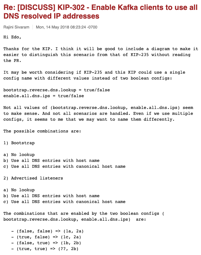 그리고 각 option별 KIP, email discussion thread, vote thread를 살펴봄으로서 어떤방식으로 option 이름이 선택되었는지에 대한 내막도 알게되었습니다. 특히 email discussion thread은 매우 인상깊었습니다. Apache kafka Committer들이 왜 이렇게 client.dns.lookup 옵션에서 3개의 option으로 나누게 되었는지에 대해 자세히 나와 있었기 때문입니다.(원래는 2개의 option으로 4개의 dns 개별 동작을 제공하려고 했었음)