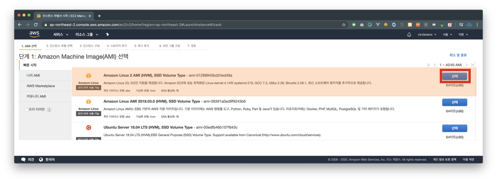 가장 기본적인 EC2 발급입니다. 기본 AMI를 사용해서 openJDK 설치하는 방법을 보여드릴것이므로, Amazon Linux 2 AMI를 선택합니다.