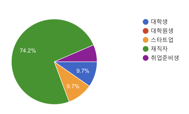 강의 시작 전 T아카데미 담당자분께 참가하는 인원에 대해 조사한 자료를 공유주셨습니다. 예상과 다르게 현직자가 50%가 넘었습니다. 대학생을 대상으로한 강의인줄 알았는데 현업 개발자분들이 오신다니 좀더 긴장되었습니다. 강의를 할때 잘못말한 부분이 있거나 실수를 하면 안된다는 생각이 들었기 때문입니다. 그러나 지난 기간동안 준비한 강의자료를 토대로 그리고 모의강의했던대로 긴장하지 말고 진행하자는 생각을 가지고 준비했던대로 하자고 마음먹었습니다.