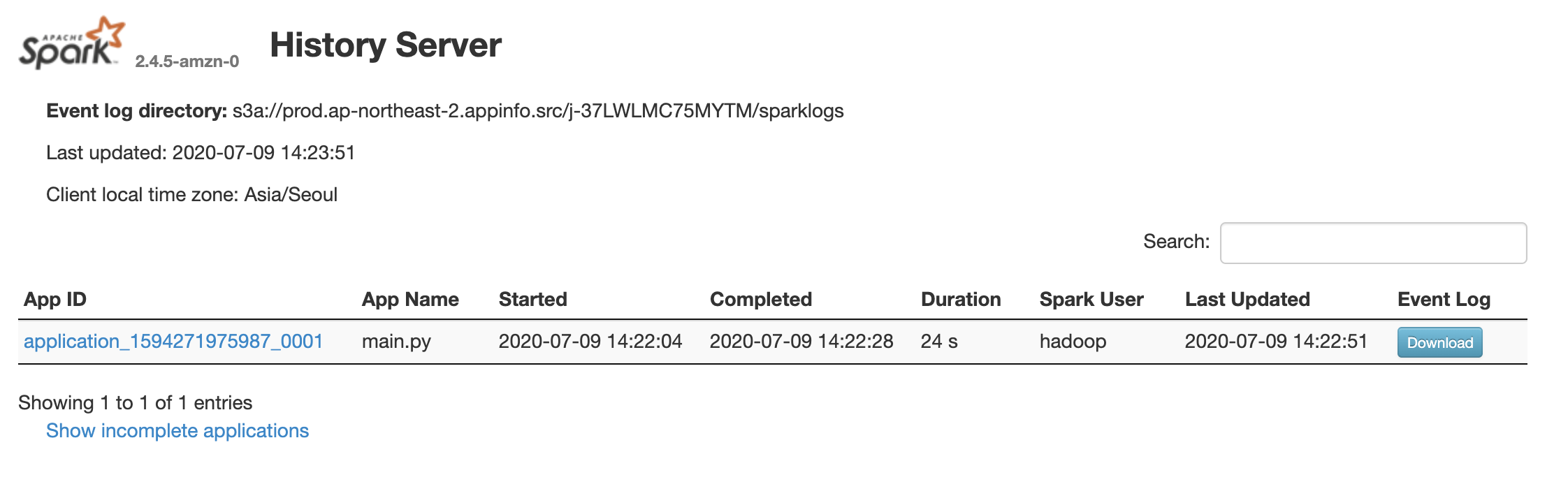 정상적으로 실행된 것을 볼 수 있습니다. EMR 클러스터를 생성할 때 사용했던 spark 2.4.5가 사용된 것도 로그에서 확인할 수 있습니다. 스파크를 돌리고 나면 스파크에 대한 히스토리도 AWS EMR 클러스터 콘솔에서 확인할 수 있습니다.