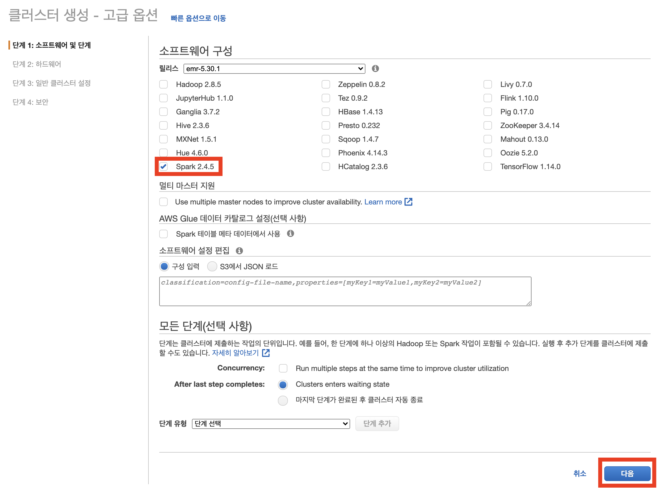 emr클러스터는 aws의 emr콘솔 화면에서 생성할 수 있습니다. 콘솔로 가셔서 아래와 같은 단계를 따라 하시면 됩니다.