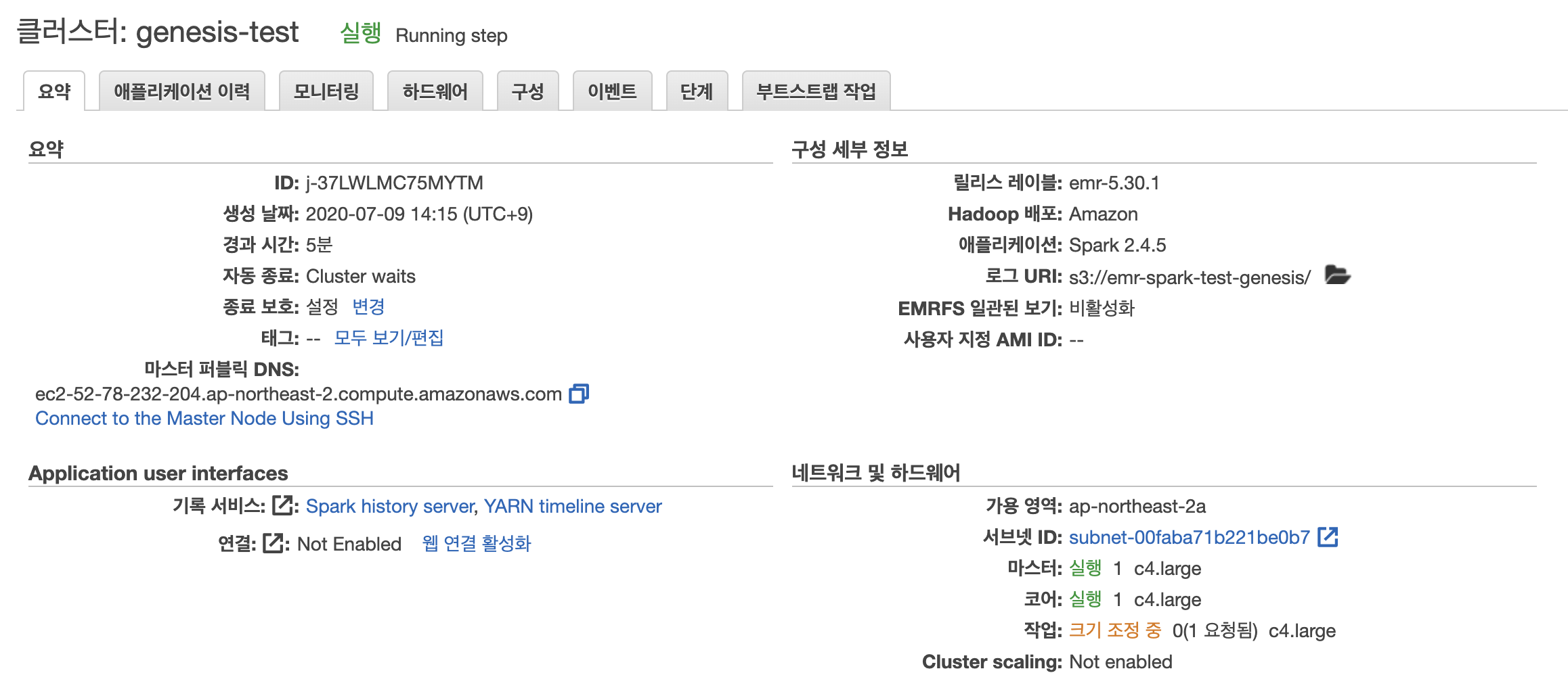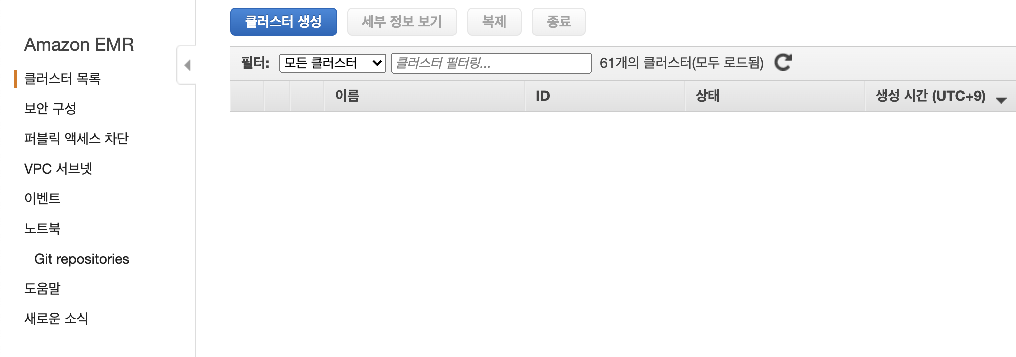 3개 인스턴스로 구성된 EMR이 설치가 완료되려면 시간이 조금 걸립니다. 짧게는 1분 길게는 10분가량 이상도 걸릴 수 있으므로 인내심을 가지고 기다리는 것을 추천드립니다.