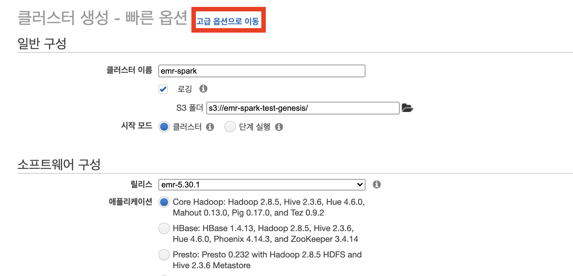 클러스터 생성시 빠른 옵션을 사용하게 되면 스파크 말고도 추가적인 프로젝트가 구성됩니다. 스파크만 사용하는 EMR클러스터를 사용하기 위해서 고급 옵션으로 가도록 합니다.