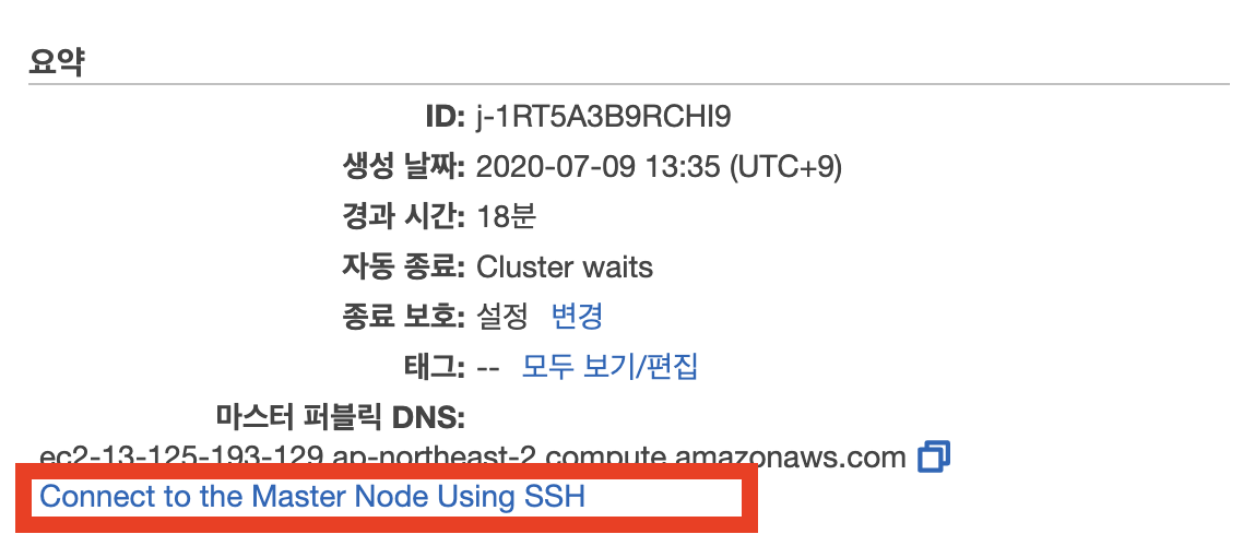 3개 인스턴스로 구성된 EMR이 설치가 완료되려면 시간이 조금 걸립니다. 짧게는 1분 길게는 10분가량 이상도 걸릴 수 있으므로 인내심을 가지고 기다리는 것을 추천드립니다.