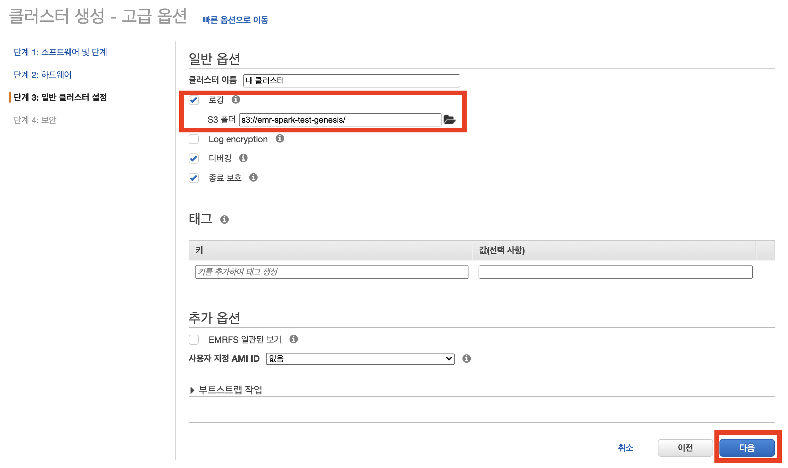 클러스터 생성시 빠른 옵션을 사용하게 되면 스파크 말고도 추가적인 프로젝트가 구성됩니다. 스파크만 사용하는 EMR클러스터를 사용하기 위해서 고급 옵션으로 가도록 합니다.