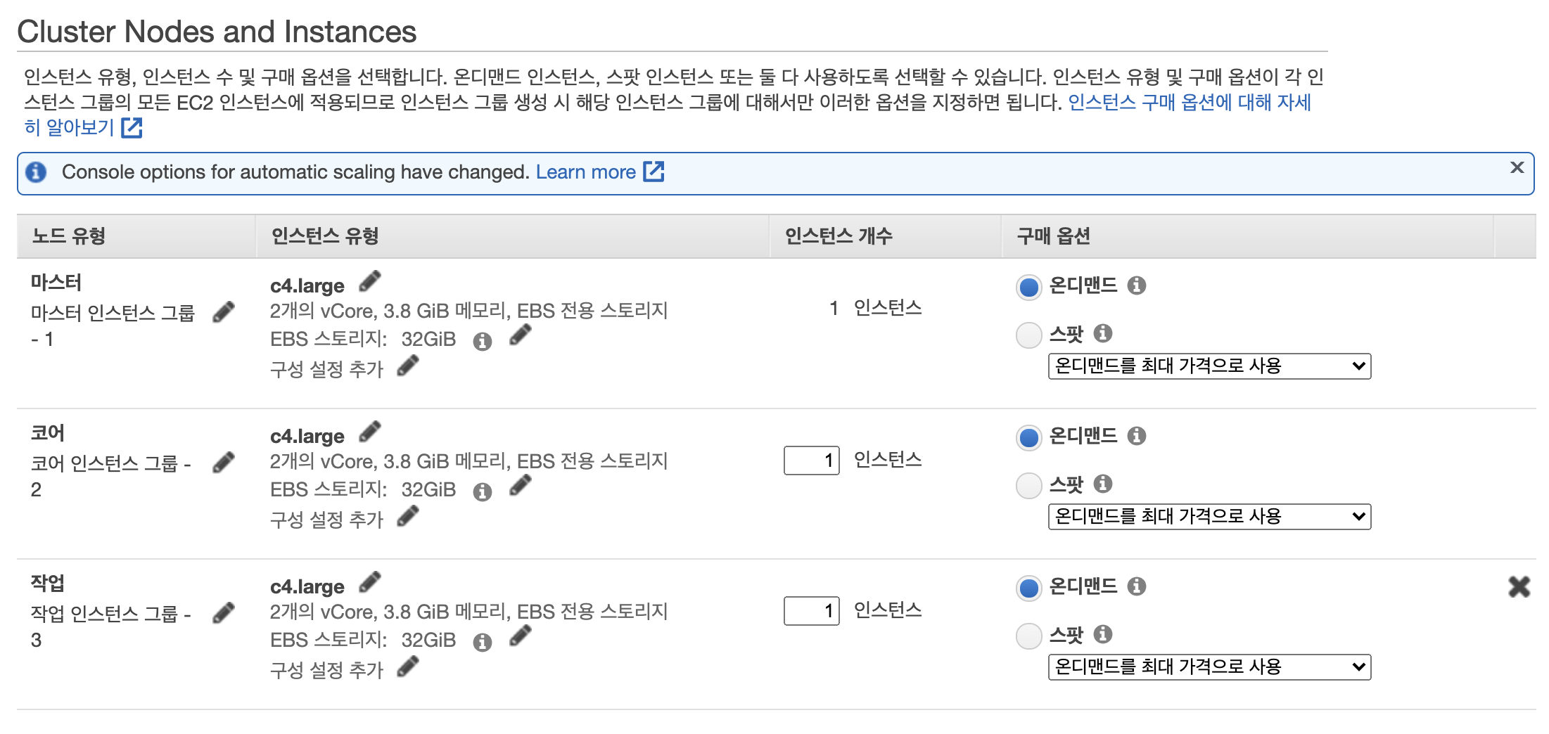 인스턴스 유형은 다양하게 선택할 수 있습니다. c4.large를 사용하면 가장 저렴한 가격에 3instance로 구성된 emr클러스터를 구성할 수 있습니다.