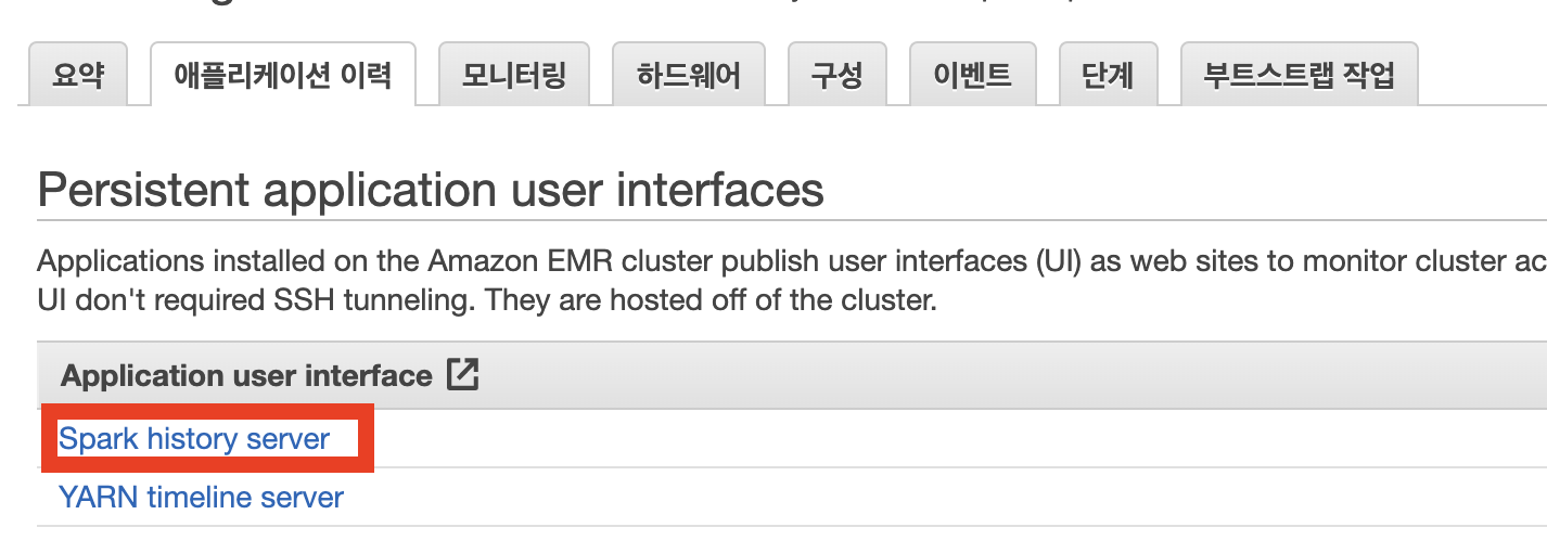 정상적으로 실행된 것을 볼 수 있습니다. EMR 클러스터를 생성할 때 사용했던 spark 2.4.5가 사용된 것도 로그에서 확인할 수 있습니다. 스파크를 돌리고 나면 스파크에 대한 히스토리도 AWS EMR 클러스터 콘솔에서 확인할 수 있습니다.