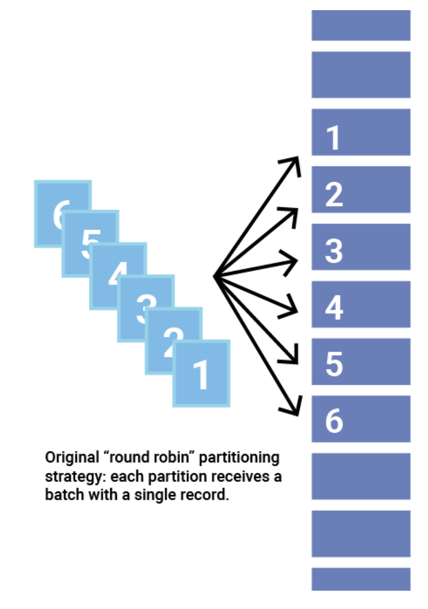 메시지 키가 없을 경우, 라운드-로빈 방식으로 데이터가 들어오는대로 파티션을 순회하면서 레코드를 넣습니다. 파티션 개수가 늘어날때도 마찬가지로 순회하면서 지속적으로 데이터를 분배하면서 넣습니다.