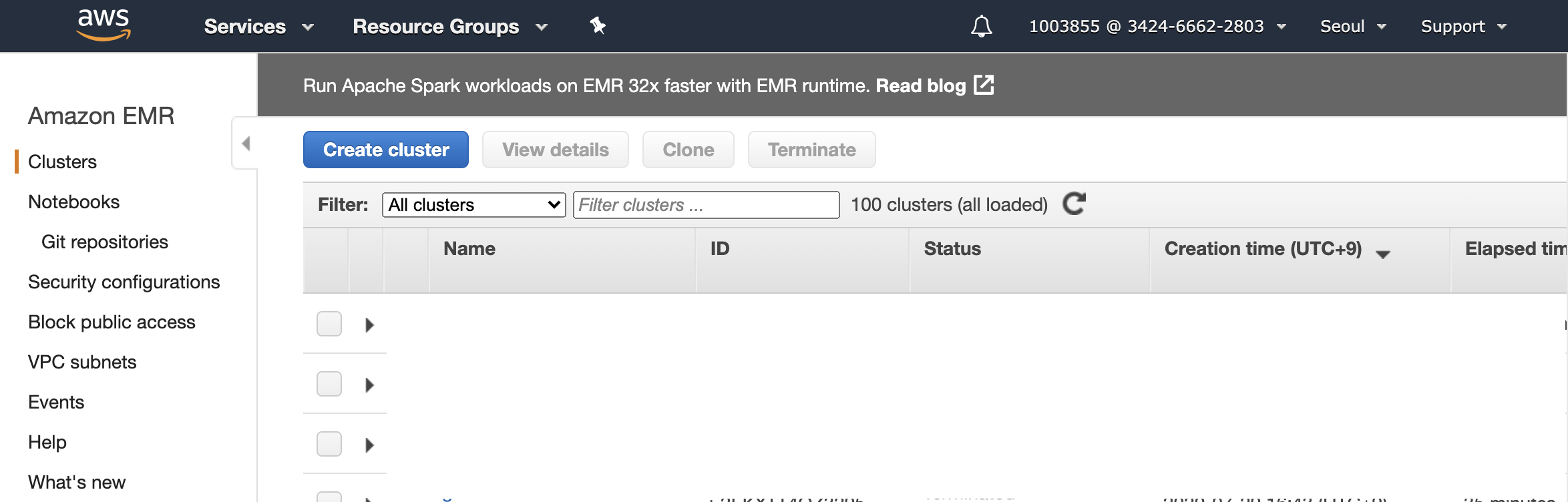이제 생성 준비가 완료되었습니다. 클러스터 인스턴스가 새로 만들어질때 마다 위 스크립트가 실행되면서 파이썬 라이브러리를 설치합니다. 설치가 완료되면 각 서버에 라이브러리가 설치된 것을 확인할 수 있습니다.