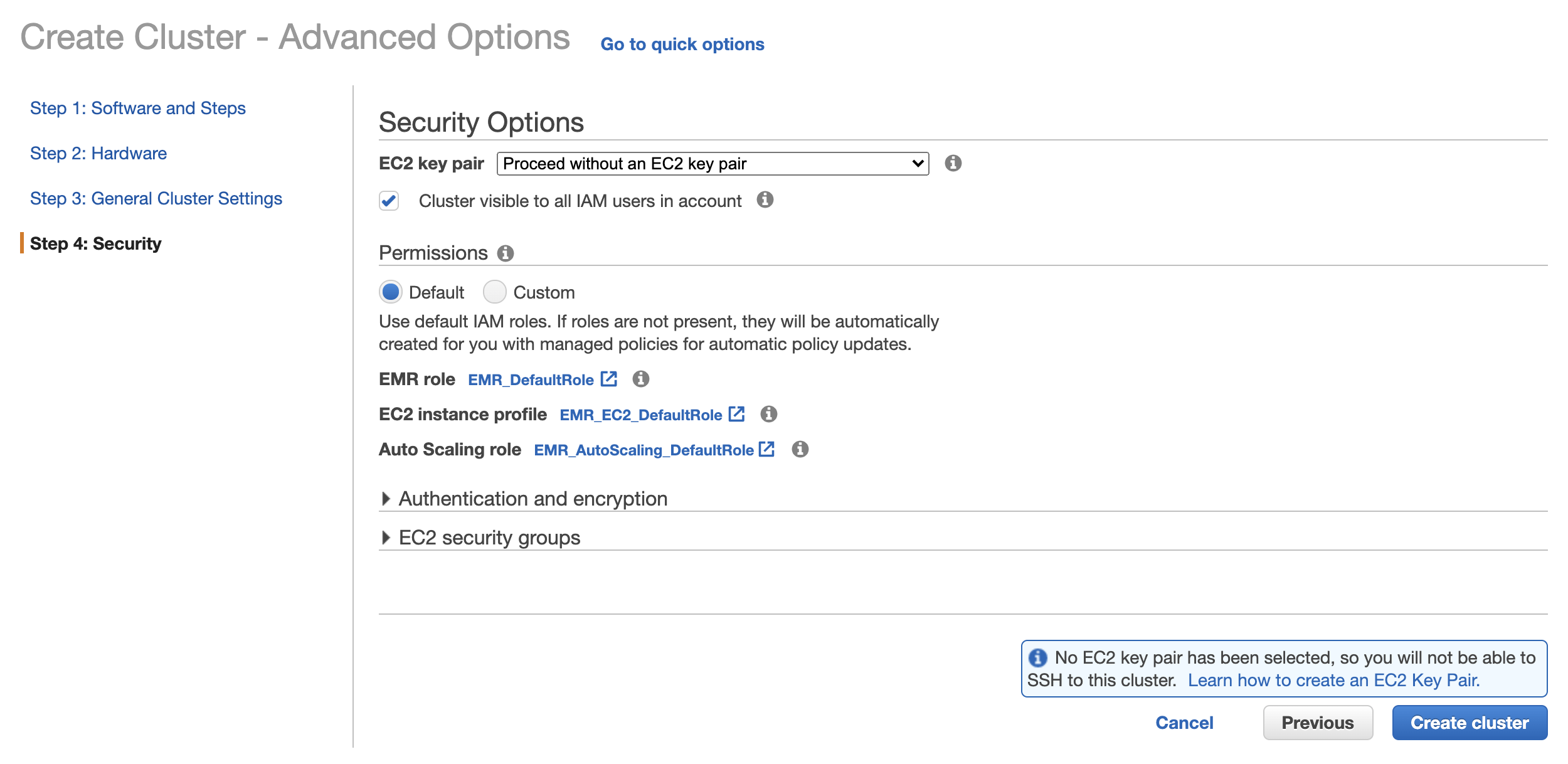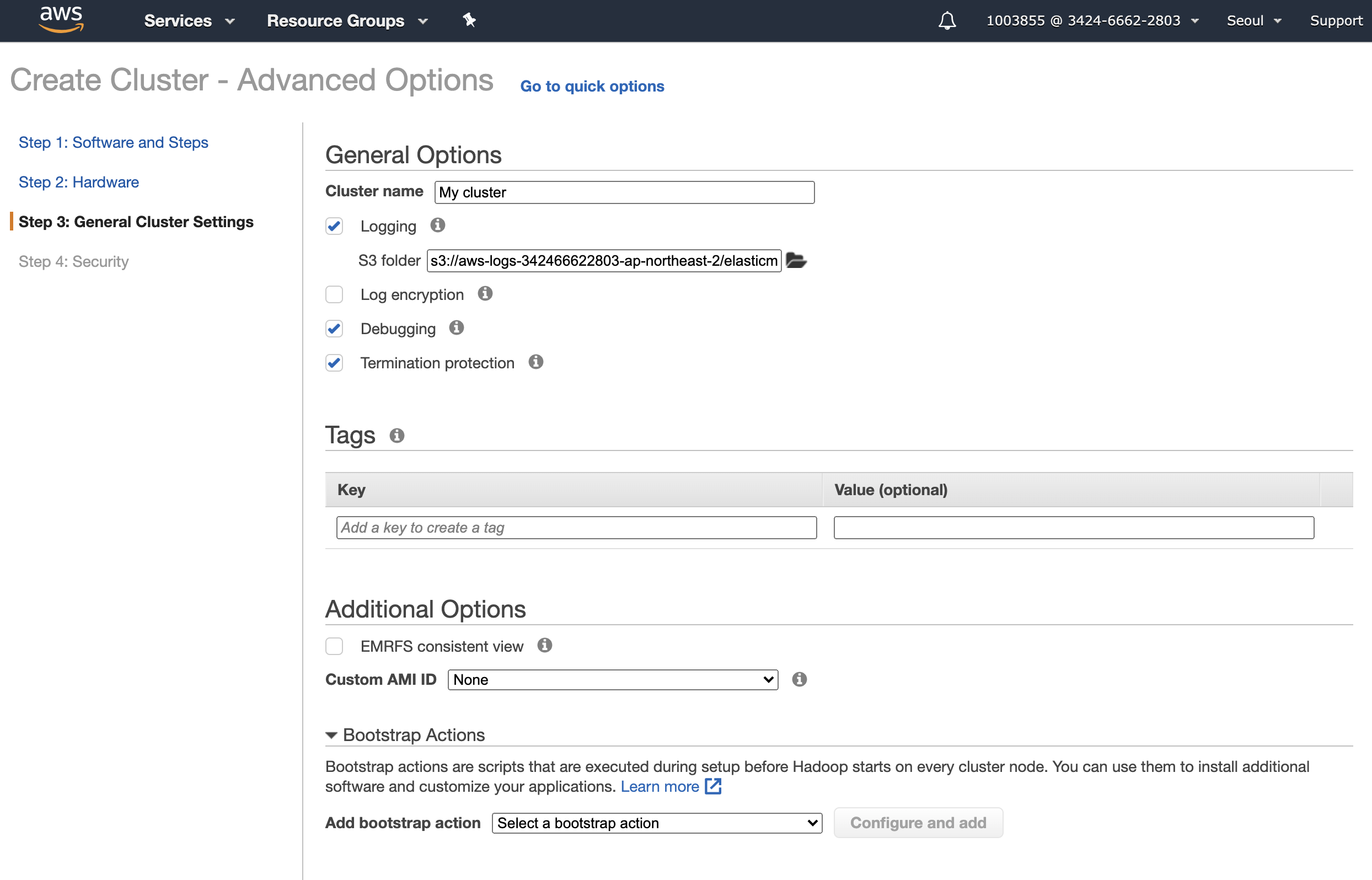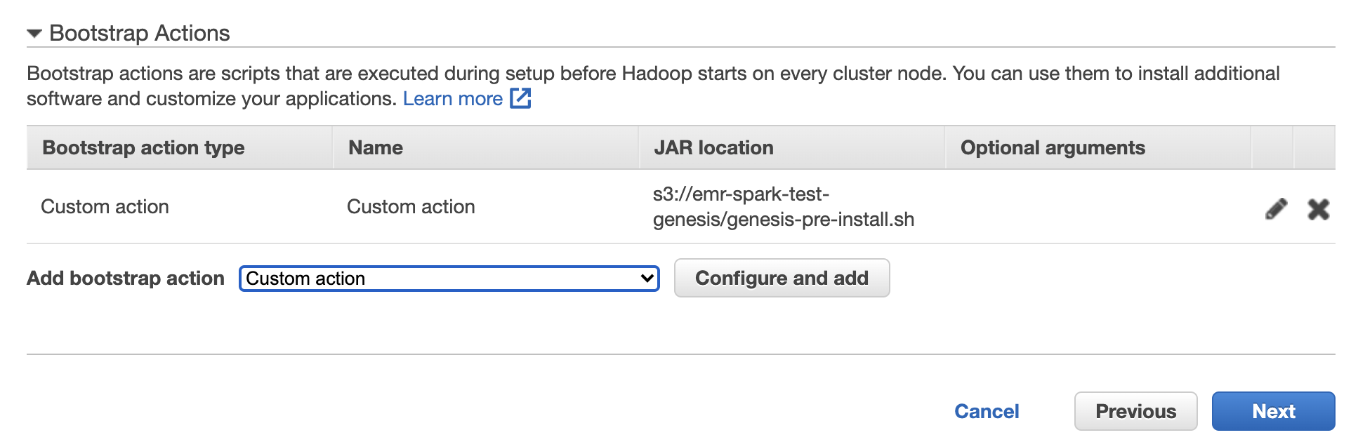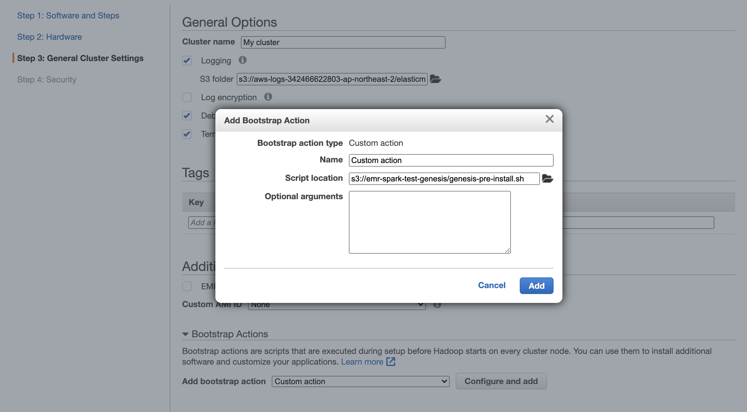 EMR에는 bootstrap action이라고 하는 인스턴스 생성할때 실행할 수 있는 스크립트를 지정할 수 있습니다. 여기에 스크립트를 추가하여 인스턴스 생성시 pip3로 python 암호화 라이브러리를 설치하겠습니다.
