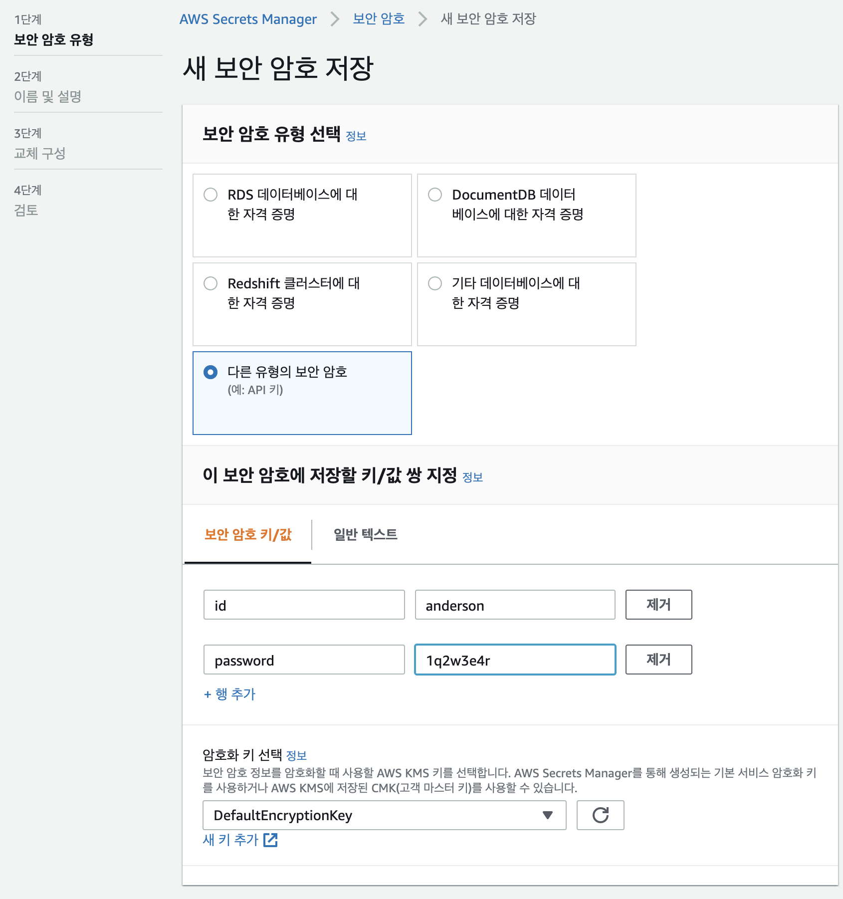 사용자 정의 비밀 키/값을 저장하기 위해 '다른 유형의 보안 암호'를 선택하였고 암호 키/값에 사용자 정의 key/value를 입력하였습니다. 이 값은 계속해서 추가 할 수 있습니다. 그리고 암호화 키는 사용자정의 마스터키를 사용해도 되지만 기본 KMS(DefaultEncryptionKey)를 사용하도록 하겠습니다.
