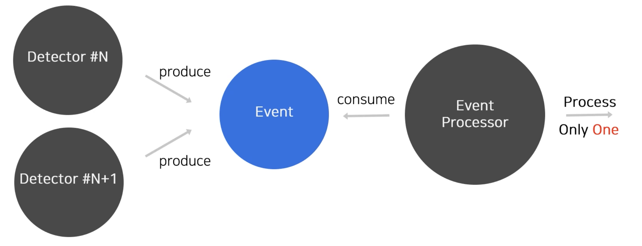 이벤트가 발생하면 디텍터는 메시지로 만들고 스트림으로 발행, 처리기는 이벤트 정보를 DB에 기록하고 담당자에게 통지를 발송하는 프로세스를 만드는게 주요 목표.