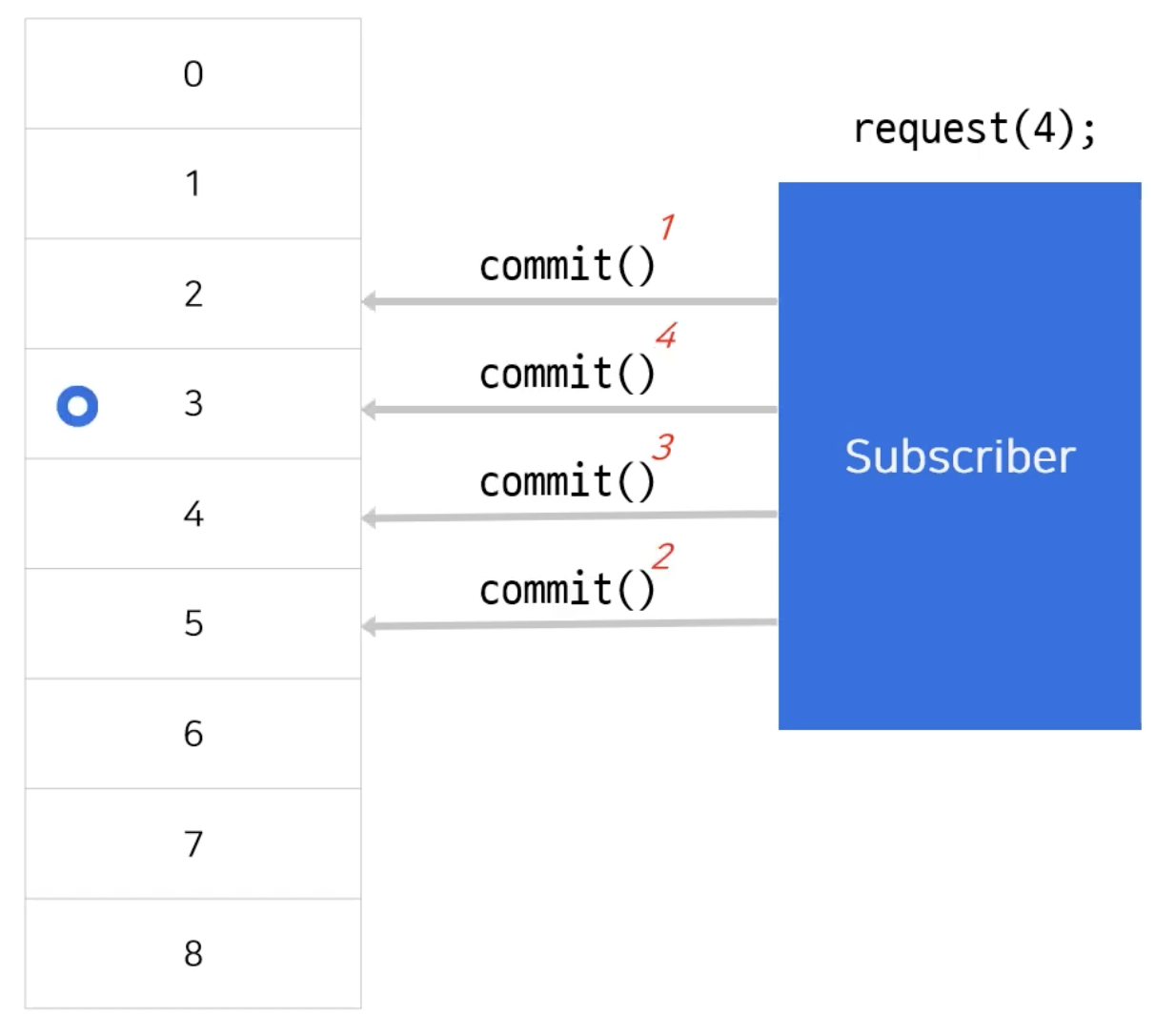 그런데 비동기로 데이터를 처리하기 때문에 커밋이 순서가 완전 꼬일 수 있다.