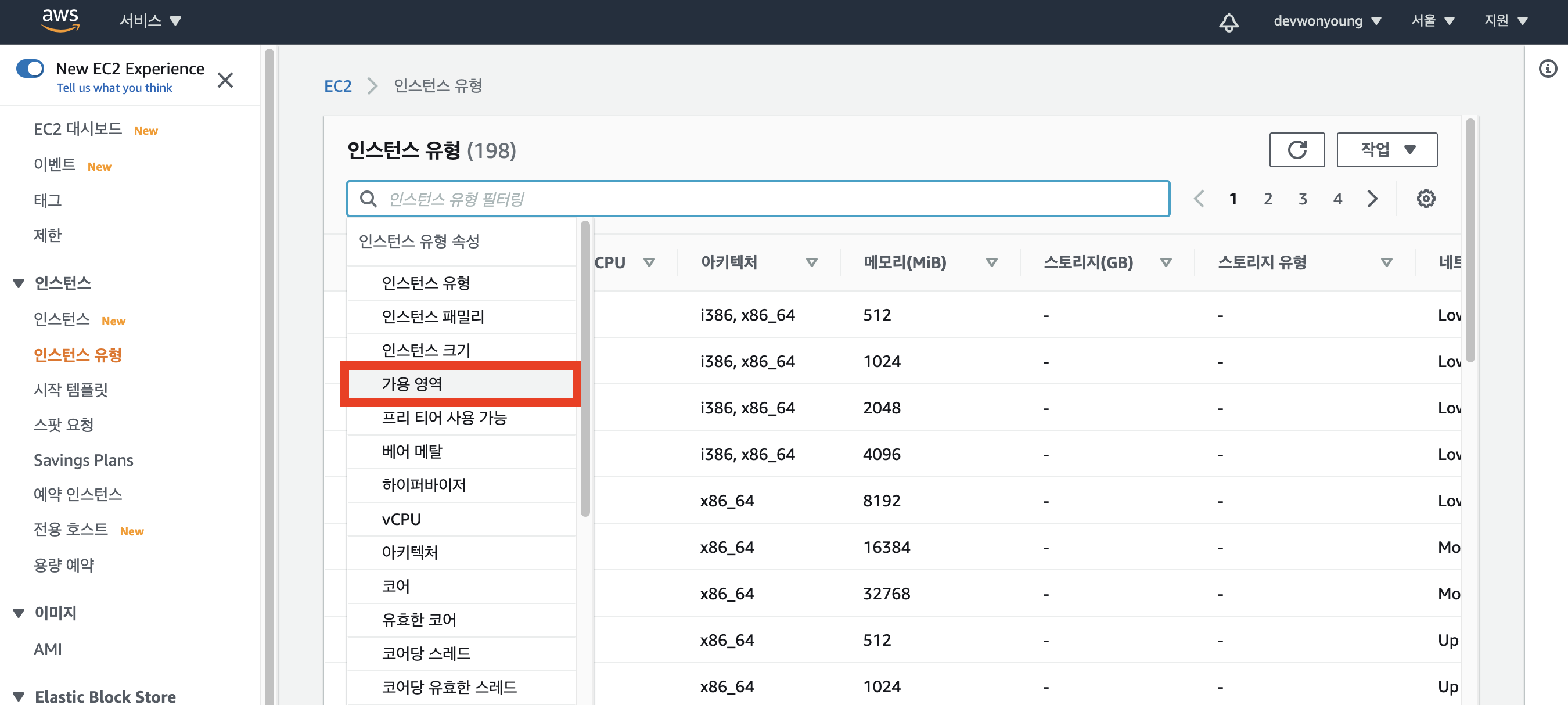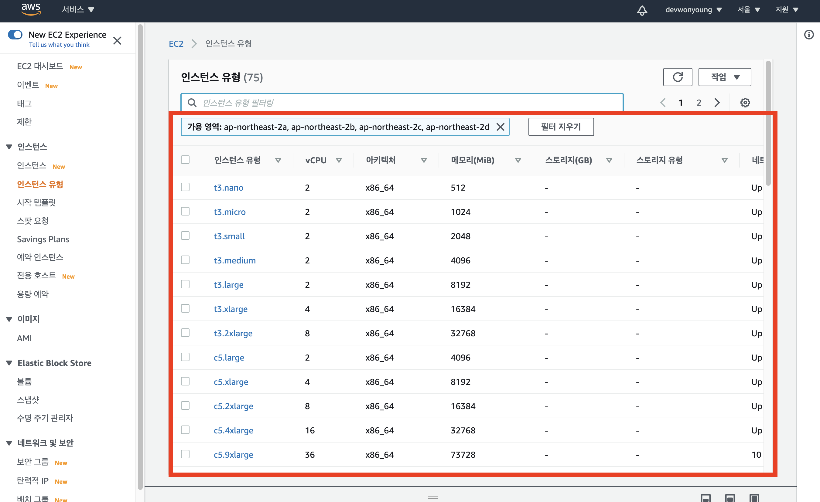 t2.micro는 4개 가용영역에서 지원하지 않는 것을 알 수 있습니다. t3.nano, t3.micro를 비롯한 여러 인스턴스가 4개 가용영역 모두에서지원하는 것을 확인할 수 있습니다.