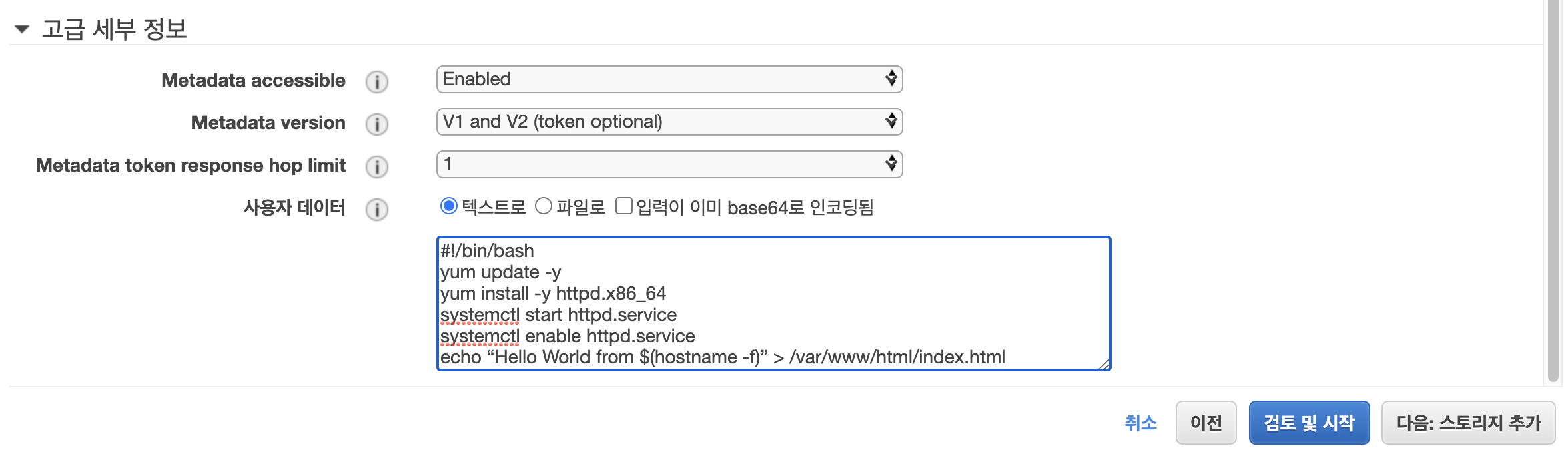 고급 세부 정보>사용자 데이터란에서 bash shell을 작성합니다. 간단한 웹서버로 Hello World 문자열이 포함된 웹페이지를 볼 수 있습니다.