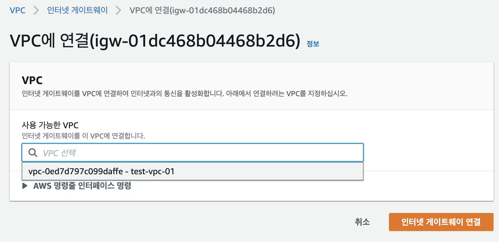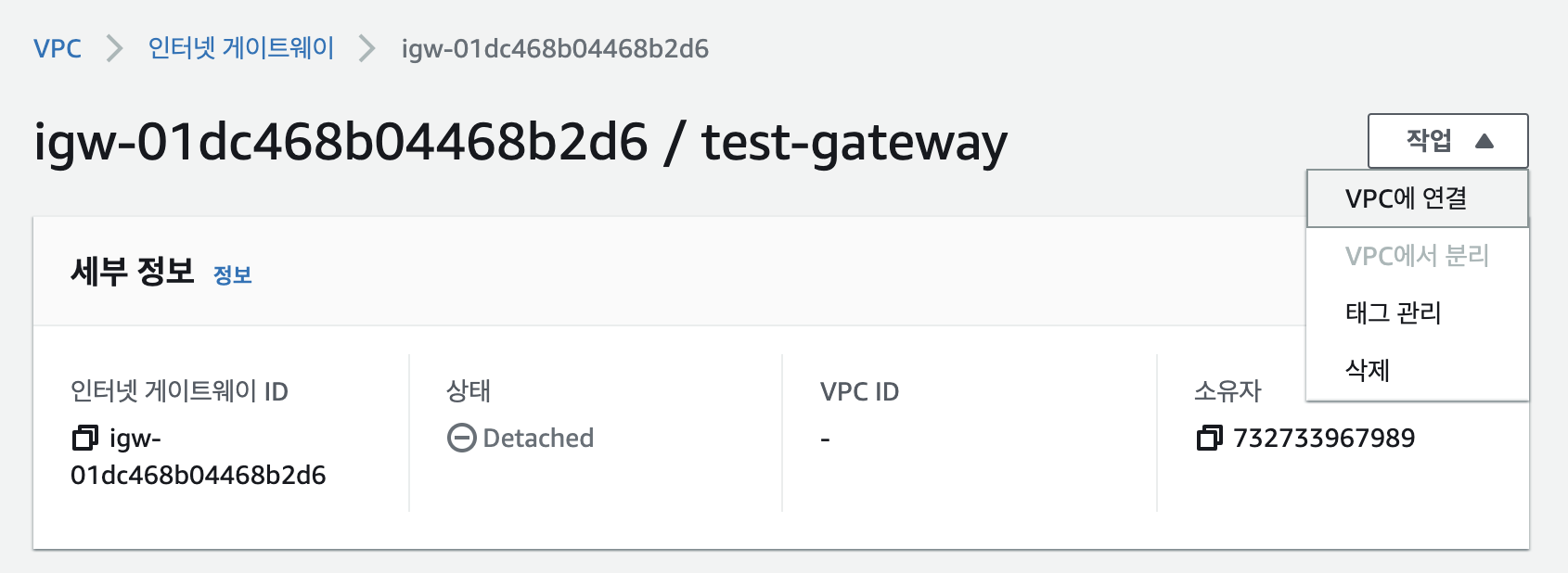 생성한 인터넷 게이트웨이는 반드시 VPC에 연결합니다. 작업>VPC에 연결 로 이동합니다.