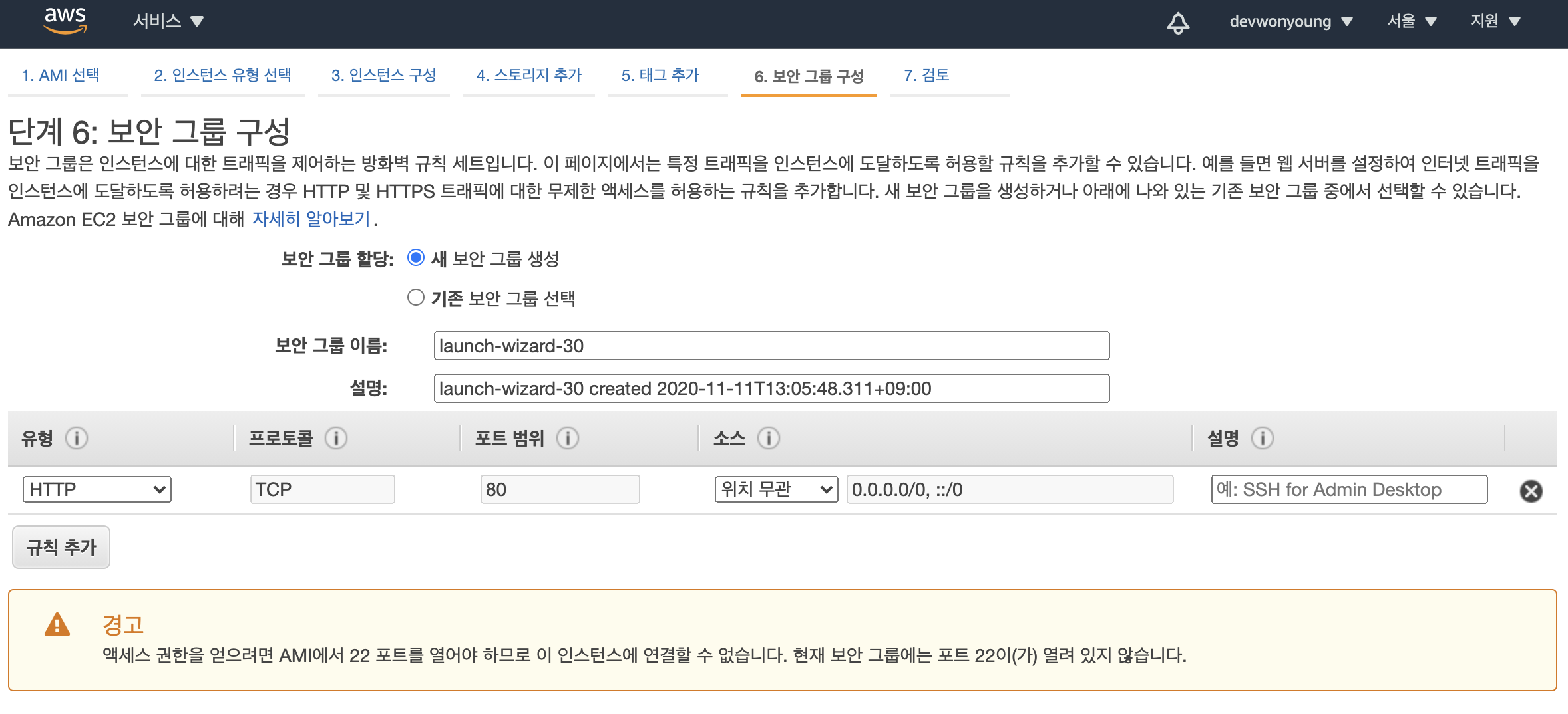 HTTP 유형의 접속을 허용하도록 보안그룹을 새로 설정합니다.