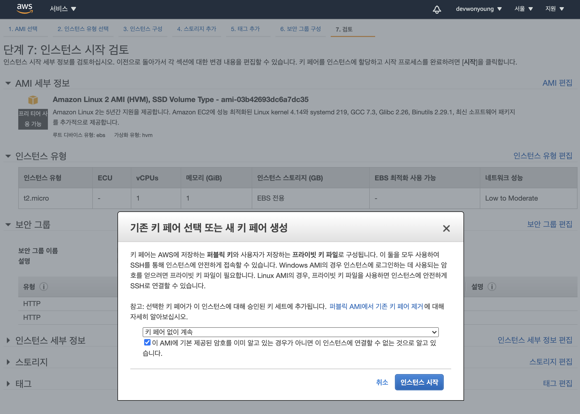 여기서는 키페어 없이 계속해도 됩니다. 접속하지 않더라도 사용자 데이터로 웹서버를 구성하기 때문입니다.