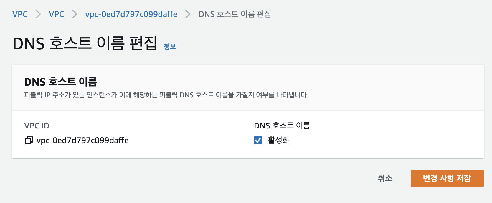 VPC생성이 완료되면 처음에는 DNS 호스트 이름이 비활성화됨 으로 설정되어 있습니다. 변경을 위해 작업>DNS호스트 이름 편집으로 이동합니다.