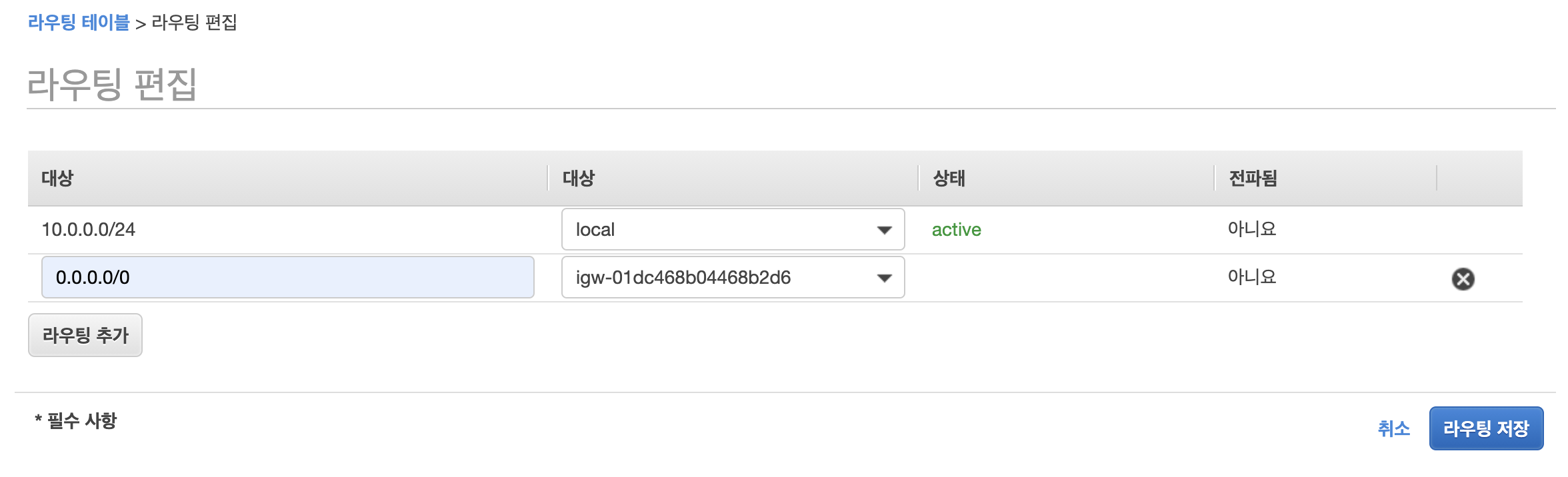 0.0.0.0/0을 추가하고 생성한 인터넷게이트웨이를 연결합니다. 0.0.0.0/0은 전체를 뜻합니다.