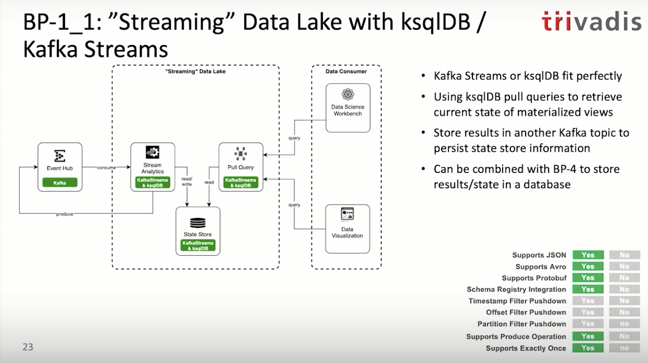 카프카를 데이터 레이커로서 그리고 소스 오브 트루스로 사용하기 위해서는 기존의 저장소(S3, HDFS)의 접근 방법과는 다르게 생각해야 합니다. 카프카의 토픽에 저장된 레코드는 스트리밍 데이터로 끝없이 이어져 있기 때문에 스트리밍 쿼리인지 배치 쿼리인지에 따라 토픽의 데이터 접근방법이 달라집니다. 기존에 데이터를 접근하던 SQL방식 접근법는 다르 다는 것을 인지해야합니다.