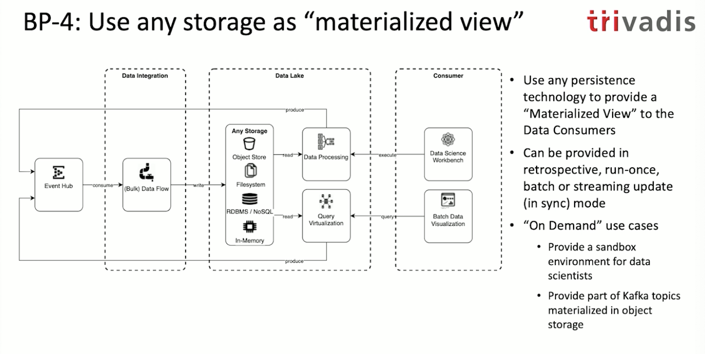 만약 이벤트 허브에 데이터들이 모아진다면 이벤트 허브를 싱글 소스 오브 트루스로 볼 수 있습니다. 이벤트 허브로 부터 오브젝트 스토리지나 RDBM에 데이터를 옮겨 넣을 수 있죠. 왜냐면 데이터를 사용하시는 분들(Data scientist, Engineer 등)은 이런 스토리지 기반 접근에 친숙하기 때문입니다. 위와 같은 구조를 가져가기 위해서는 데이터 레이크를 샌드박스(Sand box)처럼 운영해야합니다. 데이터는 모두 이벤트 허브에 있되, 원천 데이터로 부터 파생 데이터를 만들고 인사이트를 찾는 것은 데이터 레이크의 저장소에서 활용하는 것이죠.