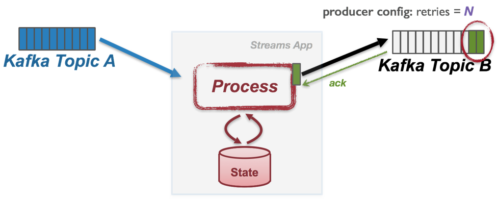 카프카 스트림즈는 기본적으로 at-least-once 프로세싱을 지원합니다. at-least-once 프로세싱이란 적어도 한번 프로세싱을 지원하는 것으로써 중복은 발생할 수 있고 유실은 절대 발생하지 않는 것입니다. 스트림즈 프로세싱에서라면 특정 레코드에 대해 처리를 하고 유실은 될 수 없고 중복 프로듀스는 될 수 있다는 것입니다.
