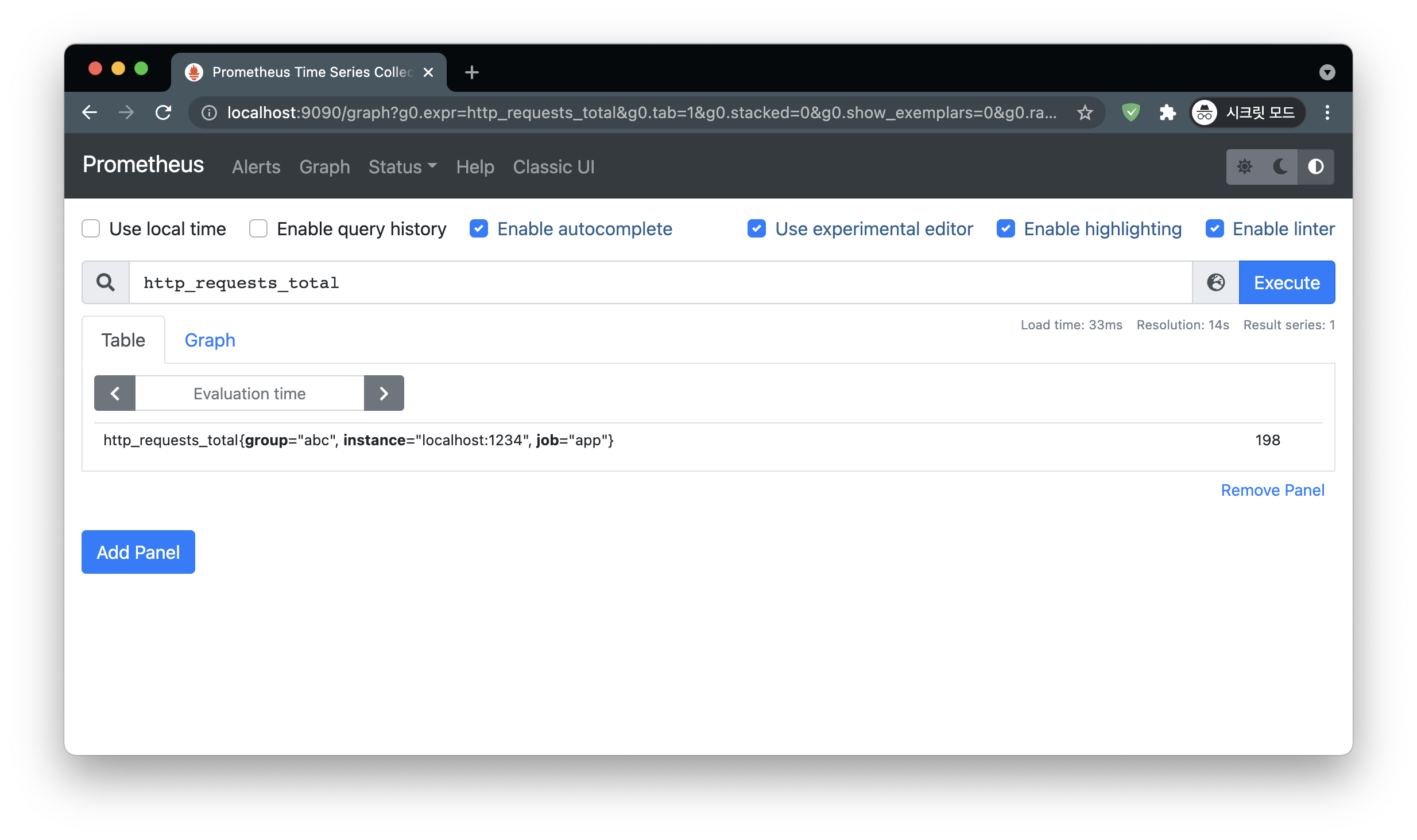 프로메테우스의 서비스 디스커버리로 해당 포트와 연결하거나 scrape_config로 해당 포트를 지정하고나면 다음과 같이 데이터를 수집이 되는것을 프로메테우스 웹 콘솔에서 확인할 수 있습니다.