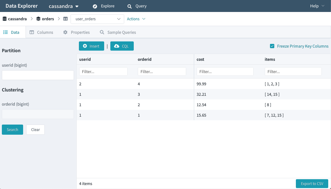 Explore 모드에서는 클러스터에서 필요한 쿼리를 날릴 저장소를 빠르게 찾을 수 있다. Explore 모드에서는 CRUD기능을 모두 제공하며 CSV로 데이터를 저장하거나 CQL insert statement를 다운받을 수도 있다. CQL을 추출하면 상용 환경의 데이터를 빠르게 테스트 환경으로 복제하여 사용할 수 있다.