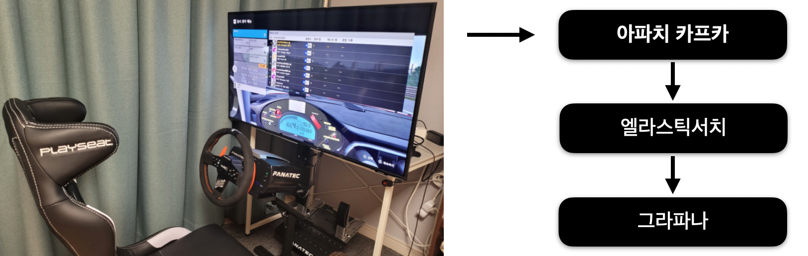 Forza Motorsports 7은 실제 카레이싱이 이루어지는 레이싱 장소들을 제현하고 상용 자동차들과 동일한 셋팅을 직접 몰아볼 수 있는 시뮬레이션 게임입니다. ABS, TCS(트랙션 컨트롤), STM(스태빌리티 컨트롤), 수동변속, 연료 소모, 타이어 마모 등 실제 자동차에서 사용되는 각종 장치들과 상황이 그대로 적용되는 특징이 있습니다. Forza Motorsports 7에서는자동차의 실시간 센서 데이터를 UDP로 특정 서버로 전송할 수 있습니다. UDP로 전송하는 데이터에는 Steer, accel, brake, yaw, turbo 등 차량의 상태를 확인할 수 있는 지표가 포함되어 있습니다. 이 데이터를 추출하고 카프카로 데이터를 보내면 데이터를 실시간 분석, 시각화, 저장할 수 있습니다. 여기서는 레이싱카의 실시간 데이터를 카프카에 적재하고 분석 및 시각화 용도로 엘라스틱서치에 저장하는 아키텍처로 파이프라인을 구성하였습니다. 마지막으로 시각화를 위해 그라파나를 엘라스틱서치와 연동하였습니다.
